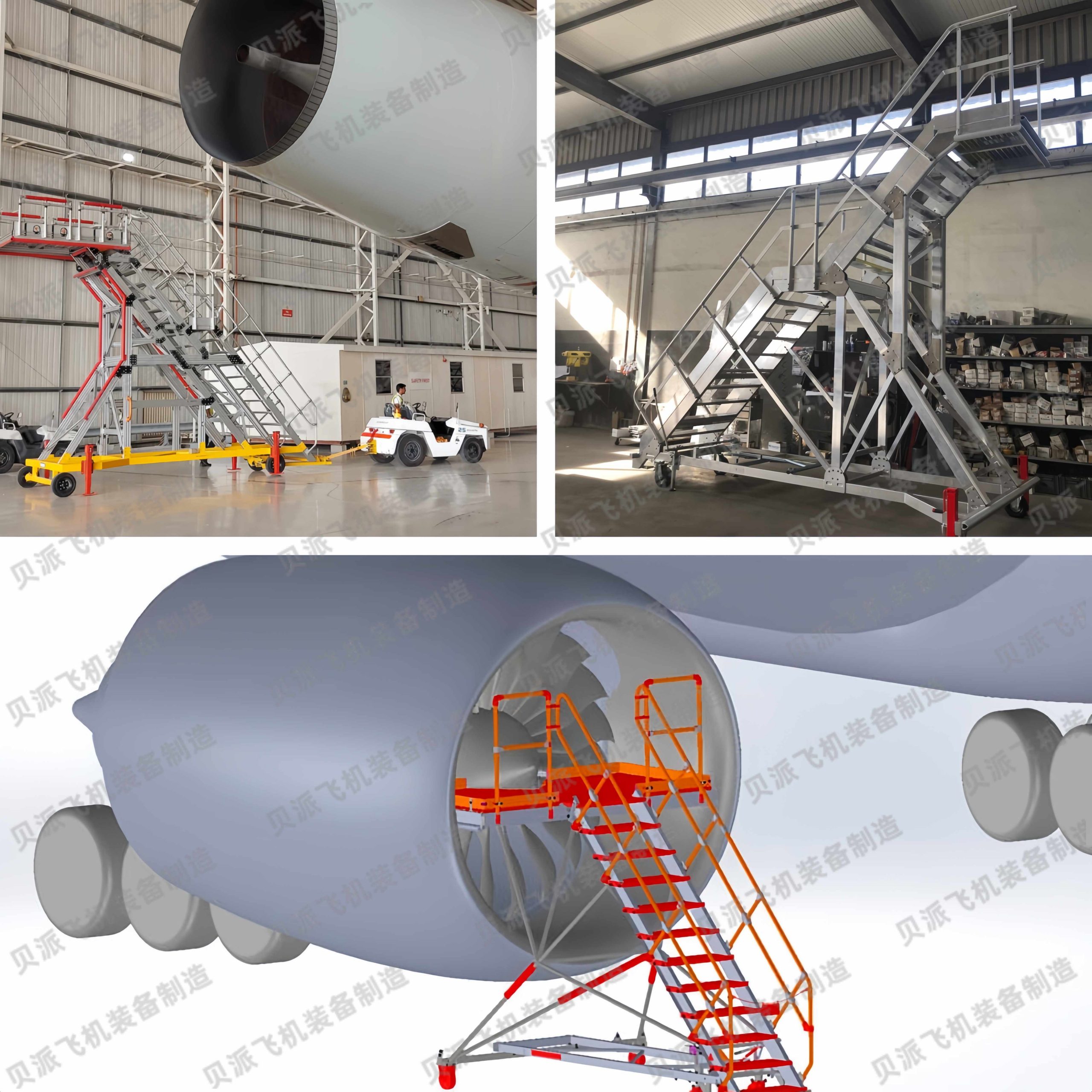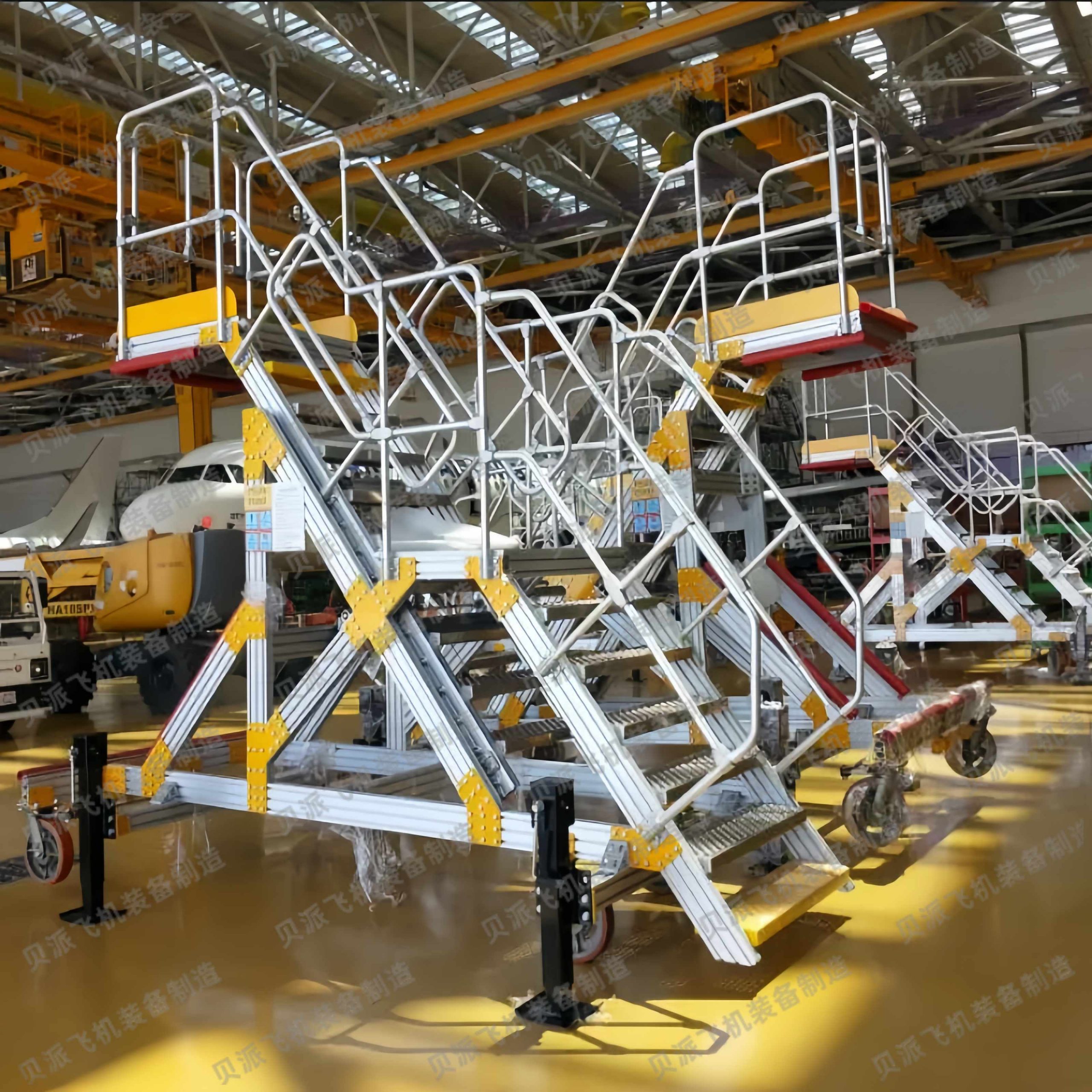 飞机维护与维修过程中,专用楼梯、登高平台梯及移动装配平台是保障作业安全与效率的关键设备。飞机外翼移动装配平台具备精准定位与高度调节功能,适用于不同机型的高空作业需求。检修走道与楼梯踏步式维修平台采用防滑、承重设计,确保技术人员在复杂环境下的操作稳定性。航空航天维修平台集成模块化结构,支持快速部署与灵活调整,广泛应用于机身、机翼及发动机区域的定期检查与故障处理。此类设备均符合航空工业安全标准,具备优良的耐腐蚀性与负载能力,有效提升地面保障作业的专业化与规范化水平,为航班运行提供可靠技术支持。